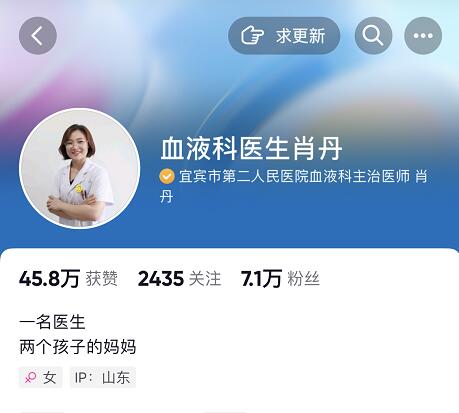 抖音上的血液科医生肖丹治血液病怎么样?这是最近很多人都在问的问题,那么血液科医生肖丹治血液病到底如何呢?可信吗?为什么抖音上这么多人都在关注她?抖音上名为“血液科医生肖丹”的账号,现在已经收获了7.1w粉丝的关注,45.8w朋友的认可,在血液科可谓是有一席之地,那么肖丹医生的医术怎么样?治疗血液病真的好吗?