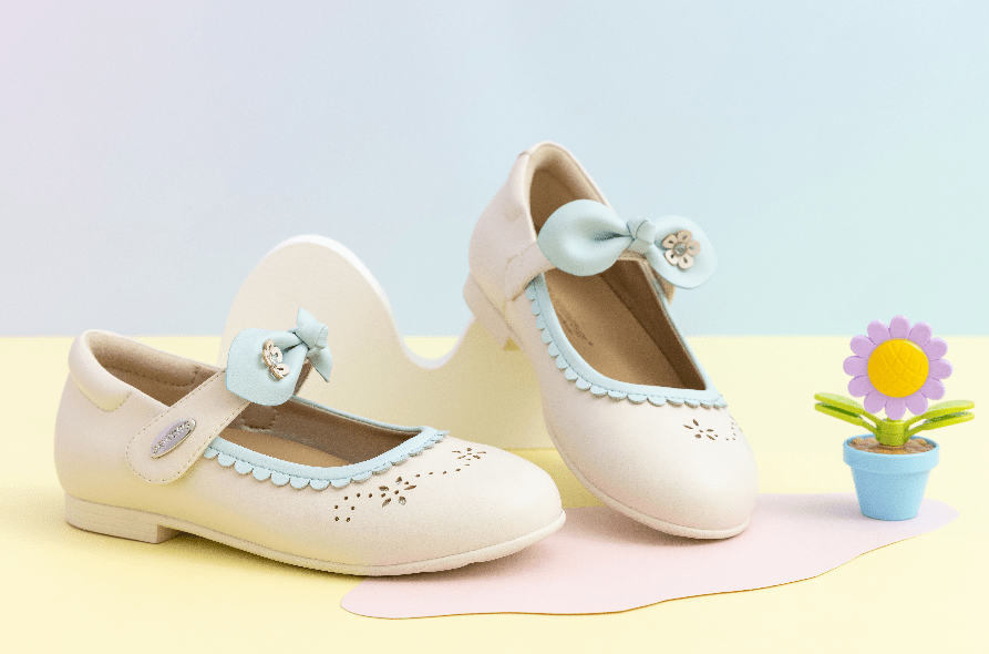 下面这双礼仪鞋可以说在幼儿园里非常受欢迎了。鞋身整体采用温柔甜美的奶白色,观感和谐而细腻。魔术贴上增加粉蓝色蝴蝶结,增强了立体视觉效果,同时穿鞋的稳固性也提升了不少。小花瓣包边设计,增添了优雅感,而且这种包边细节非常柔软和用心,能够防止孩子足部刮伤。鞋子前端采用花朵镂空设计,整双鞋子更加灵动富有公主感。