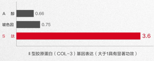 • 效能翻倍的基因表达:在促进Ⅲ型胶原蛋白基因表达的关键指标上,S肽的促胶原活性达到了传统A醇的5.5倍、玻色因的4.8倍,展现了其在抗衰维度的强劲实力。